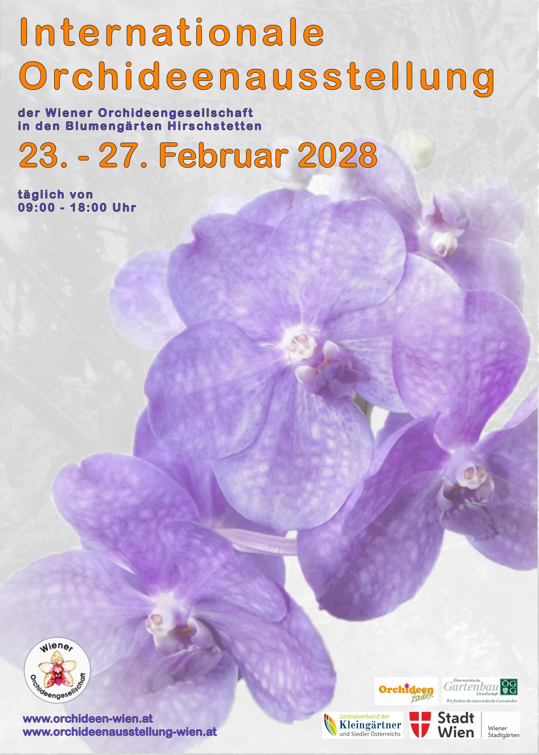 Die nächste Internationale Orchideenausstellung der Wiener Orchideengesellschaft ist von 23.02. bis 27.02.2028 in den Blumengärten Hirschstetten geplant.